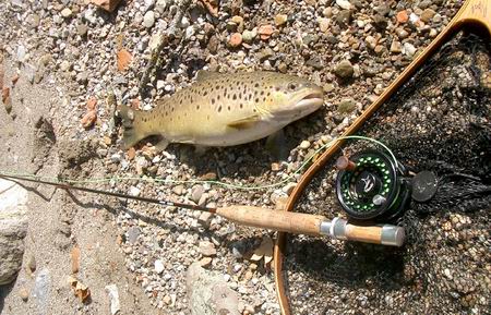 (Allround-)Rute. An der Ach kam die 7-Fuss-Rute zum Einsatz. An allen Tagen verwendete ich eine schwimmende WF5-Schnur. Beim Nymphenfischen knüpfte ich ein 16er Vorfach an; beim Fischen mit der Trockenen ein 12er sowie ein 14er Vorfach; stets Rutenlänge, beim Nymphenfischen auch etwas länger. |