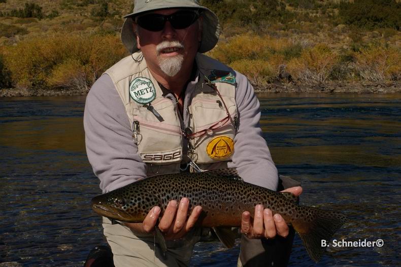 Eine bekannte Stelle, um auf laichende Forellen, die aus dem Lago Nahuel Huapi kommen, zu fischen, ist der erste Pool des Rio Limay (siehe Foto rechts). Der Straße Nr.40 nach Norden entlang des Sees folgend, erreicht man den Auslauf nach ca. 15 Kilometern. In dem ersten Stück des Flusses gilt „fly only“. Da die Strömung selbst bei niedrigem Wasserstand stark ist, sind Sinkschnüre angebracht. Ans Ende der Leine kommt ans kurze Vorfach ein Streamer, eher beschwert als unbeschwert. Zur Übersicht und Fliegenwahl hier ein Link zu einem Video: http://www.patagoniaflies.com/ video-rio-limay-fall-run-brown-trout |