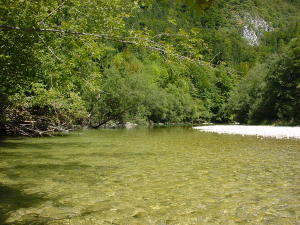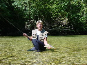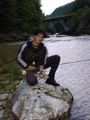 -besonders was das Fliegenfischen angeht!! Mein Freund Dirk, mein kleiner Bruder Dominik und ich sind nun schon das zweite Mal in Slowenien und dies zu einer Zeit, in der sich das Angeln eigentlich weniger lohnt (25. bis 30.08.00). Wie dem auch sei, es war mal wieder unvergeßlich. So auch der Oberlauf der Sava Bohinkja/Revier1. Tageskarten: 18,-DM. Der Fluß ist an den meisten Stellen 10 bis 30 Meter breit. Die Flußtiefe betrug ca. 0,3 bis 3 Meter Tiefe. Tiefe sandig-kiesige Rinnen wechseln mit ruhigen Partien ab, in denen etwas weicherer Boden vorherrscht. Das Wasser ist sehr kalt! |