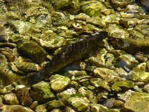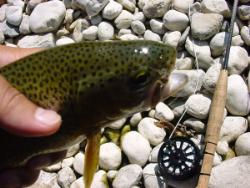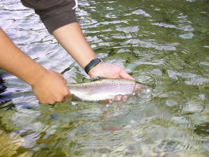 Was uns dieses Jahr besonders auffiel, waren die vielen schwarz gefärbten Bachforellen, die sich regungslos im seichten Wasser der Flüsse aufhielten und selbst, wenn man nach ihnen griff nicht die Flucht ergriffen. Der Wasserstand war erheblichgesunken und so kam es, dass sich in den wenigen tieferen Stellen die Fische nur so tummelten. Zu unserer großen Enttäuschung waren diese jedoch sehr beißfaul und ließen sich selbst mit kleinsten Trockenfliegen und Baetis-Nymphen an 0,08er Forfachspitze kaum zum Anbiß verleiten.Doch dann kam alles ganz anders...Wurf, gestrecktes Vorfach, kurze Drift - Biß. Die erste Äsche des Tages hat die Fliege akzeptiert und wird nach einem schnellen Foto wieder in die smaragdenen Fluten des Flusses entlassen. Wie gesagt - der erste Fisch des Tages - und viele weitere Fische und Eindrücke sollten folgen. Etwas weiter stromab, unterhalb eines Wasserkraftwerkes, fand sich ein großes, rauschendes Wehr. Dort, im schnellen Wasser zu fischen, ließen wir uns nicht entgehen. |