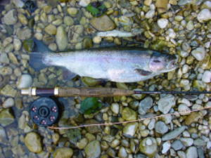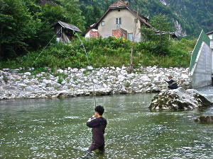 Übrigens gilt an einigen Stellen "catch&release" Unterhalb des Kraftwerkes gibt es sehr tiefe Stellen mit wirklich großen Fischen. Sogar einige gute Saiblinge bis zu 4 Pfund bekamen wir zu Gesicht, an die Fliege gingen jedoch nur zwei kleine. Allerdings kostet hier die Tageskarte ca 66,-DM. Im Frühjahr sicherlich sehr lohnenswert, da sich im Bohinj See sogar Regebogenforellen bis zu einem Meter länge herumtreiben. (Sinkschnur nicht vergessen) Wie auch immer, Slowenien:"Wir sehen uns wieder!" |