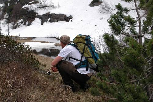 Aber die Knospen an den von den strengen Bedingungen oberhalb der Baumgrenze geprägten Erlensträuchern zeugen vom Beginn des Frühlings. Matthias hat einen Bachsaibling lokalisiert (AB) |