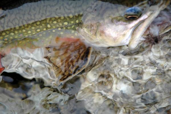 Wir fangen tolle farbenfrohe Fische. Erschöpft, jedoch sehr zufrieden treten wir nachmittags den Rückweg an. Schöner Bachsaibling auf „Pra Wu“ (MM) |