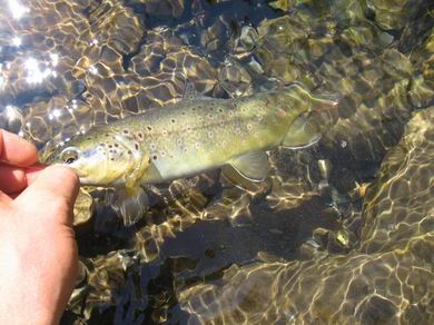 Meiner Meinung nach ist die Fliegenwahl in den Gebirgsbächen zweitrangig. Viel fangentscheidender war das werferische Können, d.h. genaues Platzieren der Fliege an fischverdächtigen Stellen, wie z.B. kleinen Kehrwassern hinter Steinen und das Halten der Fliege für einige Sekunden an dieser Stelle durch ständiges Menden und oder durch das erneute Hochwerfen der Flugschnur mit kleinen präzisen Rollwürfen. Fliegen mit Sichthilfen waren besonders in schnelleren Bachabschnitten von Vorteil. Nymphen kamen bei mir überhaupt nicht zum Einsatz. Sicherheitshalber würde ich jedoch ein paar Standardmuster einpacken. Ein sehr langes Vorfach bis über drei Meter kann in sehr stark strömenden Gebirgsbächen Vorteile für die Präsentation der Trockenfliege haben, wobei die Fische nicht irgendeine Scheu zeigten. Dieses lange Vorfach erfüllt einen ganz anderen Zweck. Man präsentiert es in einem „Knäuel“ an der Fischverdächtigen Stelle und kann somit ein paar Sekunden länger die Fliege an diesem Platz halten bis die Strömung in die Flugschnur greift und die Fliege wegzieht. |