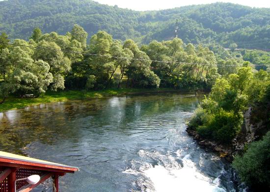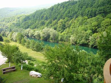 Kulen Vakuf liegt etwa 35 Kilometer von der Una-Quelle entfernt. Die Una selbst fließt mit ihren glasklarem, herrlich grün schimmernden Wassern in diesem Bereich in einem schmalen Tal, umgeben von unbesiedelten, laubbewaldeten Höhenrücken, die noch Heimat von Luchsen, Wölfen, Bären und vielen anderen Tierarten sind. Um den einmaligen Zustand zu erhalten, soll das Gebiet in Kürze unter Naturschutz gestellt werden. Die Fischerei in der Una ist in verschiedene Reviere unterteilt, die Betreuung / Bewirtschaftung liegt größtenteils in Vereinshand. Die Una - direkt an der Villa Beata |