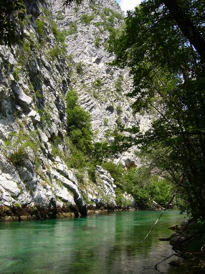 | Eine weitere Spezialstrecke ist der Fluss Unac, ein linker Nebenfluss der Una im Ort Martin Brod, rd.10 Kilometer oberhalb von Kulen Vakuf. Der wirklich traumhaft schöne Unac ist im Schnitt 15 bis 25 Meter breit, er fließt in einem Bett aus hellem Kalkschotter, sein Wasser ist noch klarer und reiner als das der Una. Die Strecke beginnt an einer kaputten Una-Brücke kurz unterhalb des Zusammenflusses beider Flüsse und reicht zunächst etwa 2 Kilometer stromauf bis oberhalb der nächsten Brücke (Auslauf Fischzucht, ein Bereich, der immer heftig befischt wird...), an der wieder ein Fischereiaufseher und Angelkartenverkäufer zu finden ist. Wer gut zu Fuß ist, sollte sich auch die Unac-Schlucht anschauen (und befischen), die sich gleich oberhalb der Fischzuchtanlage anschließt. | ![]() |