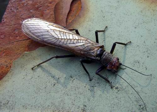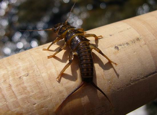 die leeren Larvenhüllen. Die großen Steinfliegenlarven kriechen