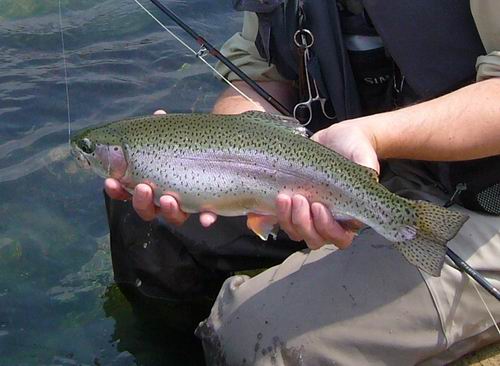 Kilogramm schwer sind. Der Fluss ist ansonsten sehr stark mit Regenbogenforellen