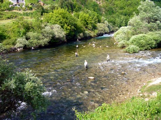 | Der fliegenfischende Gast hat die Wahl, entweder preisgünstig (Tageskarte 10,--EUR) in den allgemeinen Strecken zu fischen, welche besonders zu Beginn der Saison stark von Einheimischen frequentiert werden und nicht zuletzt auch daher – nennen wir es mal – fischereilich etwas schwierig sind. Zudem sind diese Strecken derzeit nur von Freitag bis Sonntag „geöffnet“, der Rest der Woche ist Schonzeit. Die Strecken sind rund 10 Kilometer lang, die Una ist hier im Schnitt zwischen 30 und 60 Meter breit und sehr abwechslungsreich. Lange ruhige und tiefe Strecken wechseln sich ab mit Rauschen und flacheren, gut bewatbaren Partien. | ![]() |