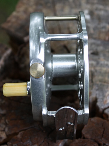 | Beschreibung und Praxistest: Hochwertige, klassische und optisch wie auch technisch sehr ansprechende Normalkern Fliegenrolle aus Aluminium, Messing und Edelstahl, aus dem vollen Aluminiumblock gefräst und tief anodisiert. Die Rollenoberfläche ist handpoliert und kommt in einem Perlsilber-Farbton mit mattem Glanz. Beidseitige stilvolle Gravuren unterstreichen das edle Design dieser Rolle. Die Spule läuft auf einem mehrteiligen Achsensystem aus Messing perfekt rund im geschlossenen Rollenrahmen, die gehäuseseitige Platzausnutzung ist optimal. Bei der Bougle wurde die sonst auf der Rollenrückseite zu findende Bremstechnik auf die Kurbelseite verlegt und das Innenleben hinter einer geschlossenen Platte versteckt. Die Rückseite der Rolle bildet dagegen die mit drei Lochkränzen versehene Spulenfront. Der geschlossene Rollenrahmen wird durch vier seitliche Stege gestützt, von denen die beiden schmalen links und rechts und der breitere für den Rollenfuß direkt mit dem Rahmen verbunden sind, während der vordere - rotierende! - Steg für die Schnurführung verschraubt wurde. Spulenboden und vordere Spulenseite kommen ungelocht. Der Rollenfuß wurde zweifach versetzt von Außen angeschraubt. Insgesamt weist die spezielle Rollenbautechnik diese und zahlreiche weitere ausgeklügelte Details auf, welche die Herkunft aus einer Meisterwerkstatt ganz kar unterstreichen. Die Gefahr eines ungewollten Durchrutschen von Schnur oder Vorfach zwischen Rollenrahmen und Spule wird durch den geschlossenen Rahmen ausgeschlossen. Auf der Spulenvorderseite befindet sich eine schöne Kurbel im Elfenbein-Stil (aus einem künstlich hergestellten Substitut), welche butterweich, absolut spielfrei und perfekt läuft. Scharfe Ecken und Kanten sucht man bei der Hardy Bouglé vergeblich, ebenso gibt es absolut keinerlei störendes Spiel, kein Kippeln der Spule in ihrer Führung, kein Schlagen und nirgendwo zu große Abstände - das alles spricht für eine ausgesprochen präzise Verarbeitung. Die (Leer-)Rolle ist jedoch bauartbedingt nicht gut ausbalanciert, sie besitzt einen "Hang" zur Kurbelseite. | ![]() |