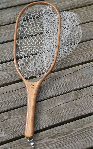 Die Kescher aus der Pro Serie werden aus in vier Lagen verleimten Rahmen gefertigt, wobei die Hölzer Teak, Cocobolo und Cristobal verwendet werden. Die Wertigkeit des Keschers ist auf den ersten Blick sofort erkennbar. Die Holzverarbeitung ist erstklassig, die hellen und dunklen Hölzer sind in Kombination absolut fugenlos verleimt. Das schöne Logo mit eingravierter Maifliege ist am oberen Ende des Griffes angebracht. Als erstes fällt mir die Leichtigkeit des Pro Keschers auf. Er liegt sehr gut in der Hand, dafür ist die schützende Polyurethanlackierung mit verantwortlich. Das schwarze Soft-Nylon Schonnetz ist sauber verarbeitet und schließt sehr genau am Rahmen ab. Das Material ist fischschonend und sehr geschmeidig. Am Griffende befindet sich ein rotierender Clip zur Befestigung des Keschers an einem Magnethalter oder einer anderen Tragevorrichtung. Er ist damit sehr gut an der Rückseite der Fliegenfischerweste zu befestigen, soweit an dieser eine Befestigungsmöglichkeit vorhanden ist. Der Cuthrout Kescher aus der Pro Serie hat ein tiefes Netz, das auch Fische jenseits der 50 cm sehr gut aufnimmt. Wer vor allem auf geringes Gewicht Wert legt ist mit einem Kescher aus dieser Serie optimal bedient. Der Cutthroat Kescher ist ein Allround Watkescher für den Einsatz an kleinen bis zu größeren Gewässern. Das Programm der Pro Serie umfasst 10 verschiedene Modelle vom kleinen Watkescher bis zum Kescher mit langen Griffteil zur Verwendung im Boot. Abmessungen des Pro Cutthroat