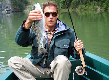 Kurzbericht von Christian Eckert Salza Mai 2004 Schon wieder einen Biss vergeigt.... Jedesmal, wenn ich den Fotoapparat rauskramen will das Gleiche. Der Indikator zuckt und verschwindet in den Tiefen des Salza Stausees. Na egal, jetzt wird die Regenbogenforelle von Knut mal fotografiert. Eine schöne gut-vierziger wird von der Nymphe gelöst und wieder Ihrem Element übergeben. Toll. |