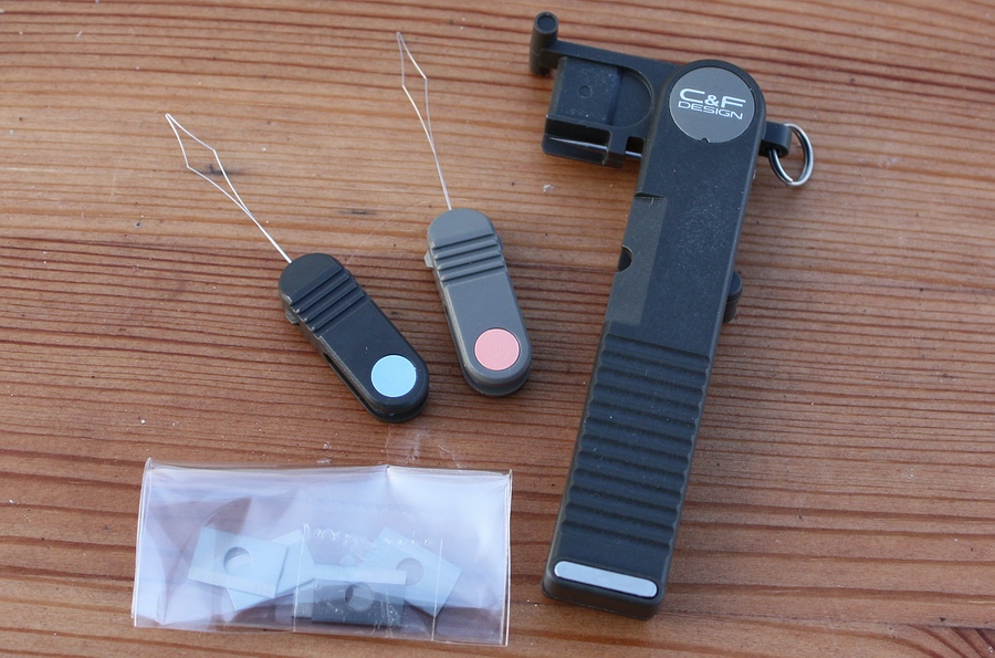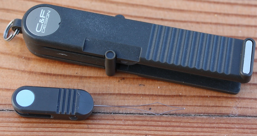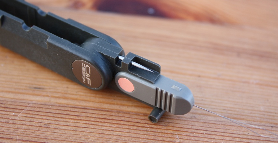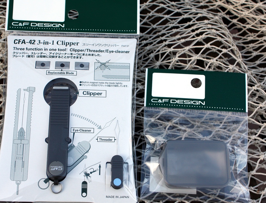 | Der CFA-42 3-in-1 Clipper von C&F Design (Japan) stellt drei Werkzeuge in einem dar: Schnurknipser, Einfädler und Hakenöhrreiniger. Das durchdachte Werkzeug besticht durch seine Einfachheit und Funktionalität. Die Besonderheit dieses kleinen und durch Kunststoffeinsatz sehr leichten Clipper-Tools ist u.a., dass es nur mit einer einzigen Klinge auskommt (anstatt wie üblich mit zwei). Zusätzlich zur bereits montierten Klinge werden ganze 8 Wechselklingen mitgeliefert, das bedeutet einen hohen praktischen Mehrwert! Auch ansonsten zeigt sich das Tool hoch funktionell: neben der praktischen Schneidefunktion verfügt es über ein seitlich 180 Grad herausklappbares Gelenk, an welchem eine geschützt untergebrachte Nadel ("Freistecher") und ein abnehmbarer Einfädler zum Vorschein kommen. Von letzterem werden gleich 2 Stück mitgeliefert. Es handelt sich um die selben Einfädler mit Farbmarkierungssystem, welche auch in den C&F Fliegendosen zu finden sind. Das Schnurschneiden funktiniert problemlos, neben den üblichen, meist dünnen Vorfächern werden auch Monofile bis über 1 mm Durchmesser mit Leichtigkeit durchtrennt. Das Auswechseln der Klingen funktioniert sehr einfach und werkzeuglos, die Klinge wird einfach in die Aufnahme geschoben, ein Magnet sorgt dafür, dass sie nicht unbeabsichtigt herausfallen kann. |