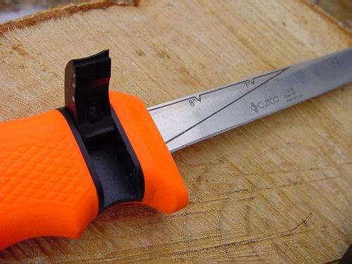 Die Messerscheide aus stabilem Kunststoff lässt sich nach dem Lösen eines Druckknopfes am Zapfen drehen und bis zu 5 cm weit öffnen, sie ist dann als Klemmvorrichtung (Zange) nutzbar, z.B. um Fische zum Verarbeiten sicher an Kopf oder Schwanz festzuhalten, zum Enthäuten, aber auch als Greifer beim Hakenlösen. Außerdem besitzt sie die Messerscheide 4 Druckknopfhalterungen, eine Gürtelschlaufe, einen integrierten Messer- und Angelhakenschleifstein und eine praktische Angelschnur- Schneidevorrichtung - ohne dabei das Messer zücken zu müssen. |