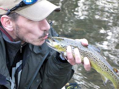 An dieser Stelle habe ich schon öfter gute Forellen gefangen. Nach einem kurzen Blick in meine Fliegendose entscheide ich mich hier für eine Goldkopfnymphe, da hier das Wasser etwas tiefer und auch die Strömung etwas stärker ist. Vorsichtig steige ich ins Wasser und fische die beiden Ufer ab. Da, plötzlich ein Zupfer, kurzer Anschlag, Mist, leider kein Fisch. Aber jetzt ist mein Jagdfieber wieder erwacht. Wieder werfe ich genau die Stelle an und lasse die Nymphe langsam absinken. Da - plötzlich kommt der Biss, kurzer Anschlag und der Fisch ist gehakt. Sofort versucht die Forelle ihr Heil in der Flucht und ich habe beide Hände voll zu tun, um sie endlich mit dem Kescher zu landen. Eine schöne Bachforelle von 36cm - so zum Feierabend, was willst du mehr! |