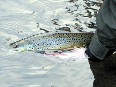 Nach kurzer Zeit brachte auch diese Nymphe den ersehnten Erfolg. Wieder eine Bachforelle. Nicht die Größte, aber einfach wunderschön gezeichnet. |
