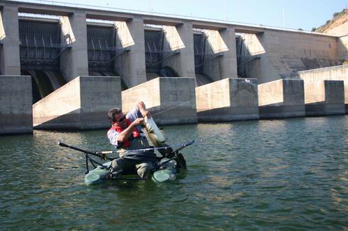 Nach 21 Stunden Fahrt von Wien kamen wir, meine Freundin und ich, endlich im Camp von AA an. Da ich von der Fahrt sehr mitgenommen war und wir noch unser Zelt am Campingplatz aufstellen mußten, beschloss ich an diesem Tag nur mehr eine kleine Ausfahrt mit dem Bellyboat auf Schwarzbarsche zu machen. Nach ein paar schönen Drills überkam mich dann doch sehr schnell die Müdigkeit, und so beließ ich es bei 4 Schwarzbarschen. Ich hatte ja noch genug Zeit! |