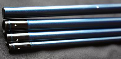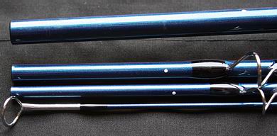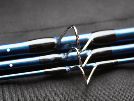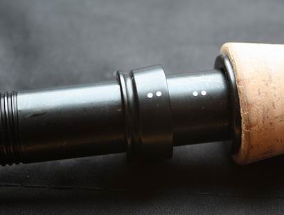 Glanzlackierter, "Metal-Pearl"- dunkelblauer Blank aus hochmodulierter Kohlefaser. Die Verbindungen der Einzelteile wurden als exakt passende Überschubverbindungen ausgeführt, die oberen Enden der Ruteneinzelteile wurden gegen das Eindringen von Schmutz und Wasser abgedichtet. Beringung: Handteil ohne Beringung und ohne Fliegeneinhängeöse, zweites Teil mit zwei SiC-gefütterten KIGAN Dreibein-Leitringen und einem Schlangenring, drittes Teil mit drei Schlangenringen, Spitzenteil mit vier Schlangenringen und dem Spitzenring. Alle Ringe besitzen besonders große Durchmesser und hohe Materialstärken, sie weisen die nötigen Abstufungen auf. Die Ring- und Zierbindungen wurden in Schwarz ausgeführt, an den Übergängen der Einzelteile und am Handteil gibt es zudem silberblaue Zierwicklungen. Alle Bindungen wurden reichlich stark lackiert und gründlich versiegelt. |