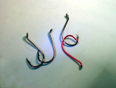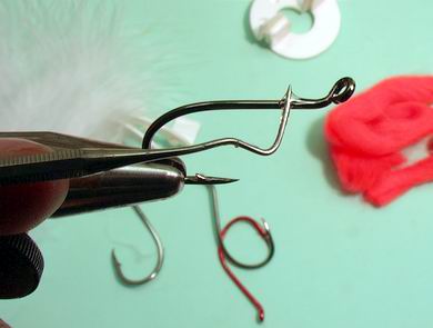 | Waller- oder Lachshaken der Gr.5/0 | Und schon können wir starten. Ein Haken wird in den Schraubstock gespannt und mit Bindelack benetzt. |
