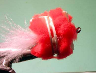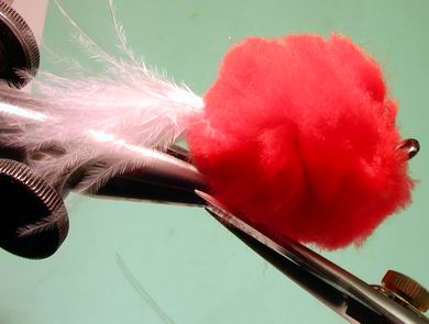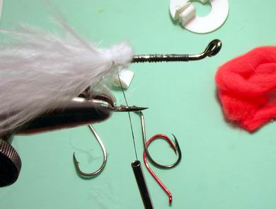 | Es wird eine sorgfältige Grundwicklung in den Lack gelegt, sehr wichtig. | Die Grannen der Marabufeder werden auf den Haken aufgebunden, sie sollten 4 bis 5 cm über den Hakenbogen stehen. Sie imitieren die Schleimhaut, welche die Lachseier umgibt, nach dem sie den Fischkörper verlassen haben. |