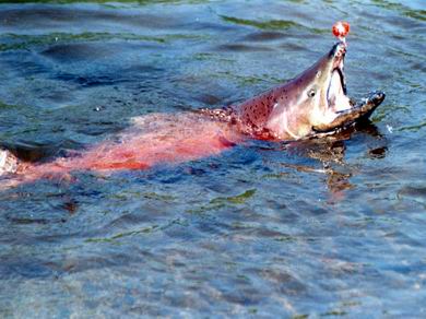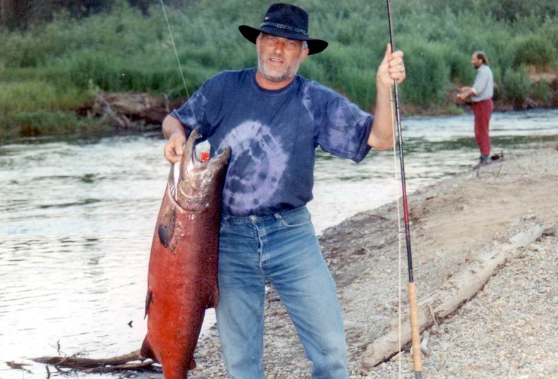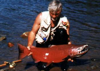 <= Wer möchte nicht einmal in seinem Leben einen solchen Königslachs fangen. Nicht verzagen Ulli Bussmann fragen ! Natürlich kann man einen solchen Lachs in der Regel nur in Alaska fangen, aber wie? Kennt man die Lebensgewohnheiten eines Königslachses, dann kann man es sehr wohl. Der Königslachs ist sehr daran interessiert seine Art zu erhalten - so wie alle Tiere und so ist auf seinem langen Zug zu den Laichgründen große Vorsicht geboten, denn Räuber lauern überall. |