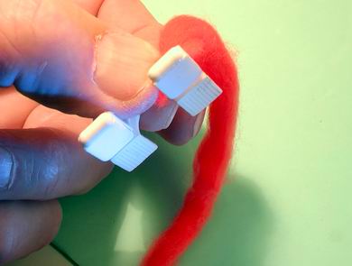 | Beide Hälften verfügen über eine positive und eine negative Steckverbindung, die wir zu einem Kreis zusammenstecken. | Wir führen nun die Spitze einer scharfen Schere zwischen die beiden Plättchen und durchschneiden den Garn einmal kreisrund. |
