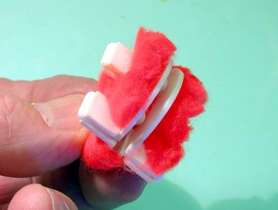 | Die starke Bindeseide zwischen die beiden Scheiben führen und den Garn fest auf den Hakenschenkel in den Sekundenkleber einwickeln und sichern. | Nun können wir die Scheiben wieder trennen und entfernen. |
