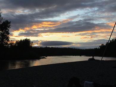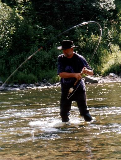 Auch der Mensch? Wenn er sich auskennt, weiß er, dass nicht nur das Lachs-Männchen, sondern auch das Weibchen bestrebt sind, ihre Eier dort hin zu bringen, wo sie laichen. Denn das Weibchen verliert nicht selten diese kostbare Fracht auf ihrem beschwerlichen Marsch, vorbei an Stromschnellen, Felsen und bei Fluchten vor Ihren Feinden. Also sammeln beide die verloren gegangenen Eier im Maul auf, und tragen sie mit stromauf zu ihrer Laichgrube. Natürlich gehört man als Angler dort auch selbst zu den Jägern, aber mit einem kleinen Unterschied: wir sind Fliegenfischer und wissen, wie man mit einem solchen wunderbaren Lebewesen umzugehen hat. In der Regel kann ein solch schöner Fisch seine Reise nach dem Fangen wieder unverletzt fortsetzen. |