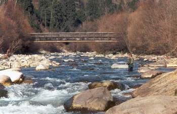 Es gibt jedoch bei uns eine wahre Vielfalt an schönen Gewässern, vom kleinen Gebirgsbach mit dem klaren Bergsee zum wild stürzenden Fluß. Foto links: R. Pegoretti beim Befischen der Passer. |