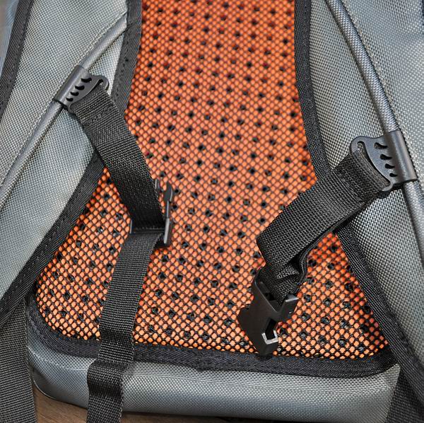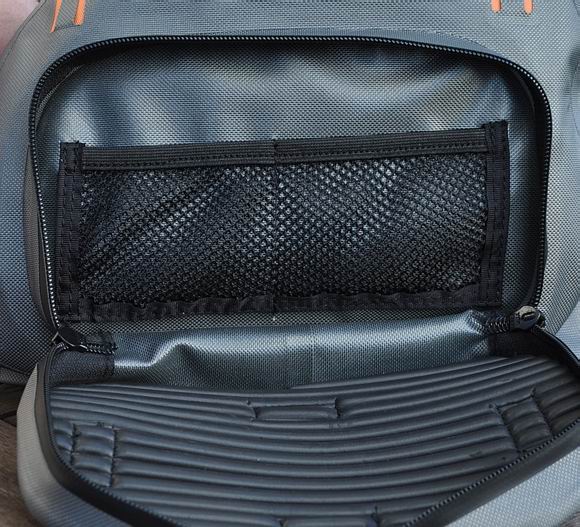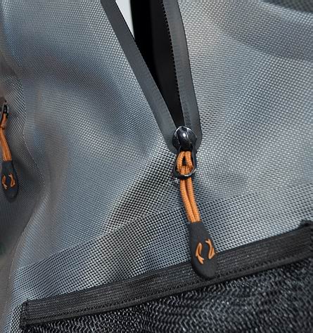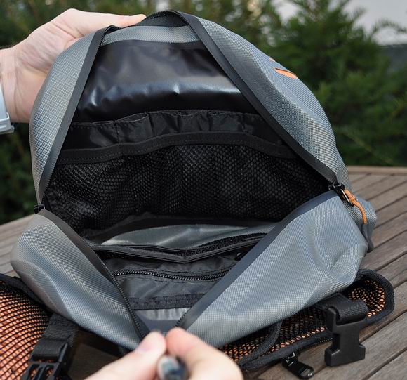 Der Rucksack ist von unten her wasserdicht (da alle Nähte abgeklebt sind), er eignet sich wie alle Daypacks für tausend Anwendungen und ist ob seiner „Wasserdichtigkeit“ perfekt für die Fischerei, um darin empfindlichere Ausrüstungsgegenstände oder trockene Kleidung, usw. unterzubringen. Er verfügt über ein größeres Hauptfach mit wasserfestem YKK-Reißverschluss, darüber noch über ein kleineres Nebenfach mit wasserfestem YKK-RV, einer Seitentasche sowie Spanngurten für die Aufnahme von Rutenrohren. Das Tragesystem ist sehr ergonomisch und verfügt über die beiden Träger, ein gepolstertes Rückenteil, einen Beckengurt und über höhenverstellbare Brustriemen, um das Gepäckstück der Anatomie des Trägers anzupassen. Diese dienen dann auch als Verbindungsteile, die es erlauben, den Rucksack mit der Bauch/Hüfttasche zu verbinden. Außerdem wird dem Rucksack einen Innentasche beigefügt, die zur Aufnahme eines Tablets oder Laptops dient und mittels Druckknöpfen im Hauptfach befestigt werden kann. Spannriemchen erlauben es, z.B. Ruten oder Rutenrohre verlässlich zu sichern. |