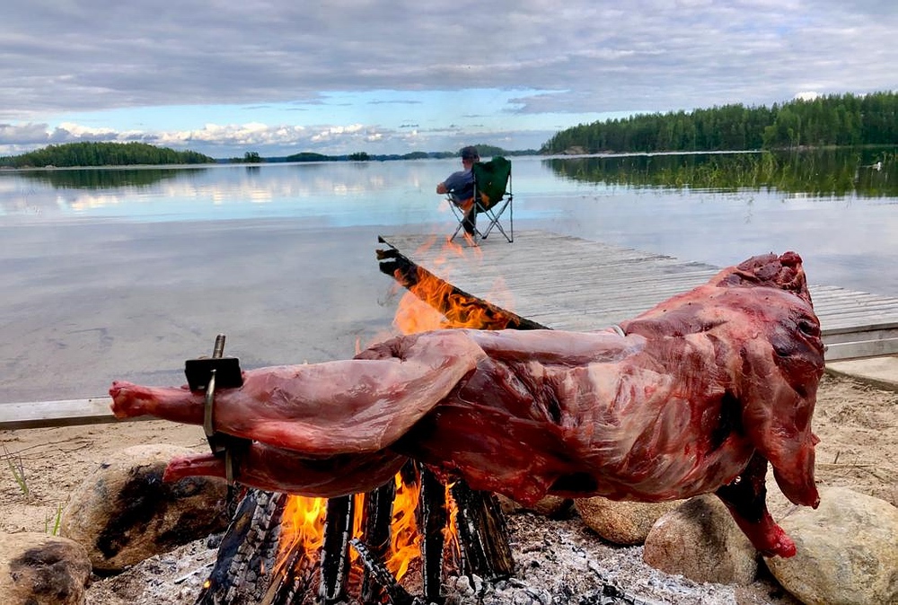 | Fischereilich muss man zu Finnland, was Barsch und Hecht angeht, ja nicht viel sagen. Da waren meine Erwartungen generell hoch. Jedes der traditionellen Blockhäuser hat ein weiteres Haus für eine Sauna wie auch einen finnischen Grillplatz mit Blick über das nicht enden wollende Wasser mit seiner typisch finnischen Baumlandschaft. Da fanden wir uns zum Dinner ein. Von Hecht über Elch Entrecote, angefangen bei den Muikkos (kleine Maräne), wurden wir beim live Cooking über Feuer von Roland, immer in Begleitung eines ausgezeichnet korrespondierenden Weines bekocht. Völlig fertig in Erwartung auf den kommenden Tag, ging es dann in die komfortablen Häuser. Der kommende Morgen hätte nicht spannender sein können. |