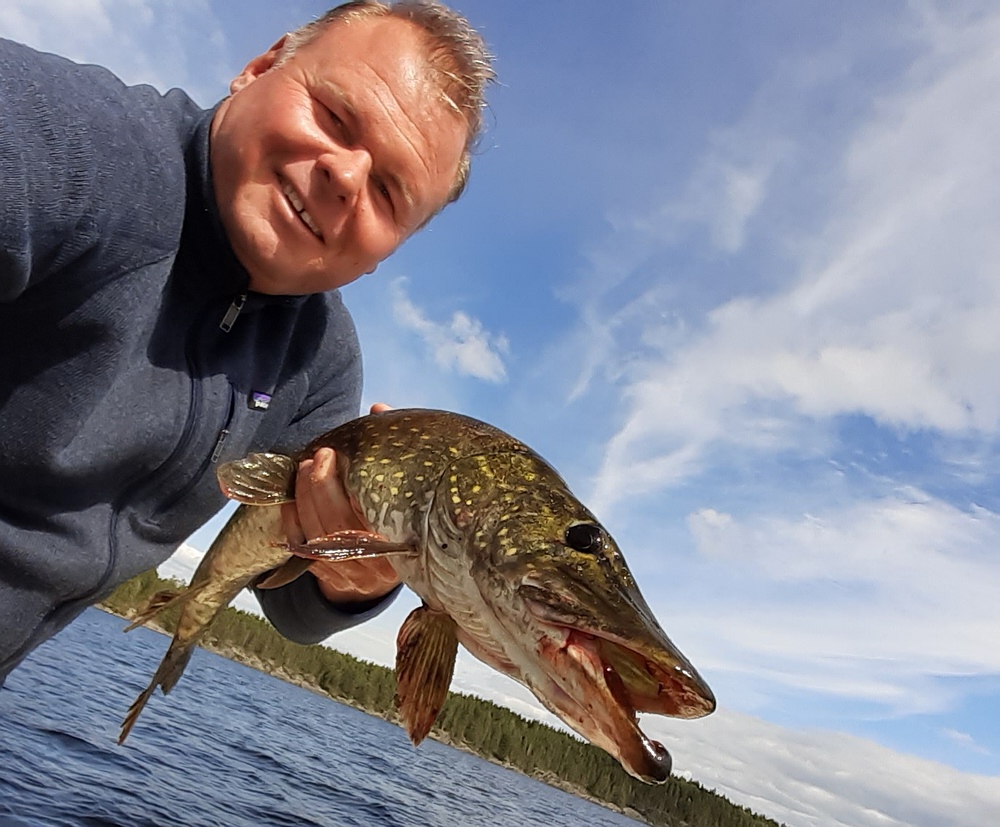| Am kommenden Morgen war ich um 6:29 Uhr verabredet und war um 6:28 und 59 Sekunden am Steg, um Ruan abzuholen. Ebenfalls ein Gast des Camps. Raus zum Fischen hieß das Motto. Wir fuhren die ersten Stellen an und es wurde uns schnell klar, so einfach wir es nicht. Die Fische standen tief und es war sehr windig. Nicht so klasse zum Fliegenfischen. ABER die Herausforderung wurde angenommen und alsbald mit einem schönen Hecht belohnt. Wenn ich nun erzähle wie ich diesen in ca. 16m Wassertiefe gefangen habe, ist das doch recht ungewöhnlich fürs Fliegenfischen. Erst die intermediate Schnur in Klasse #8, dann Fluorocarbon, dann Stahlvorfach und zu guter Letzt vor dem 25 cm Streamer ein 15g Blei, um auf Tiefe zu kommen. Aber es geht!!!! | ![]() |