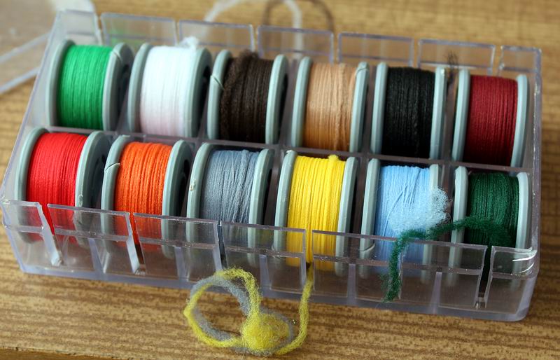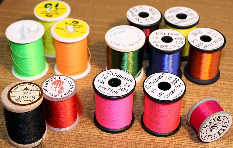 | Im Gegensatz zu den (Flach- oder Oval-)Tinseln (siehe Teil 1) wird Floss ursprünglich nicht als Rippung von Fliegenkörpern eingesetzt, sondern für das grundliegende Formen derselben - oder auch für das Hervorheben einzelner Körpersegmente und Akzentpunkte. Meist in Konsistenzen, welche beim Binden breit auffasern, gibt es Floss in den verschiedensten Farben und ebenfalls aus natürlichen Materialien (wie Seide) und aus synthetischen Fasern. |