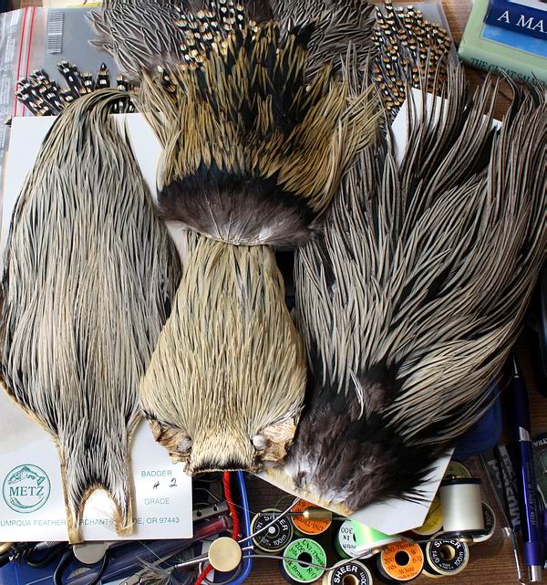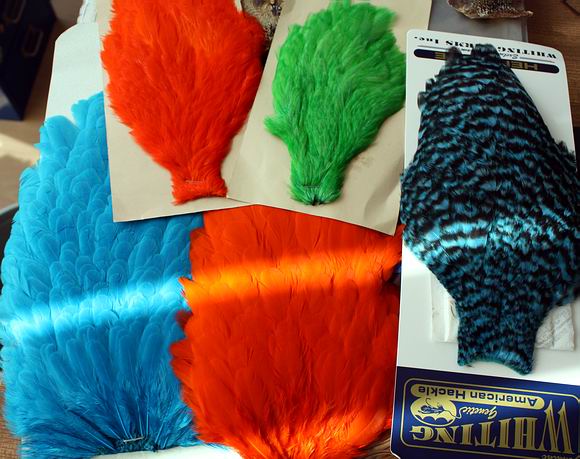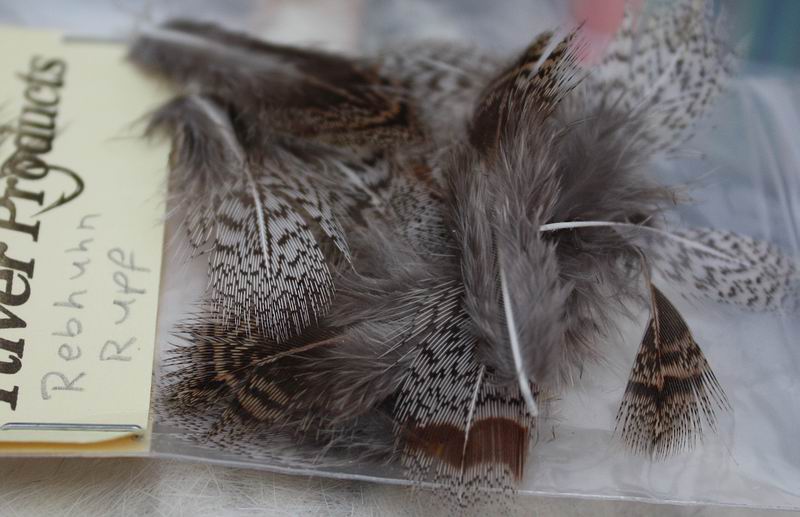| Mit dem Einsatz als Hechelkranz ist die Funktion einer Feder beim Fliegenbinden jedoch bei Weitem nicht abgetan. Ganze Federn, Federsegmente oder einzelne Fiebern aus Federn kommen neben der Hechel auch noch bei vielen weiteren Bindeschritten zur Anwendung: für Schwänzchen, Flügel, Fühler, Schwingen, Körper und vieles mehr! Ob man dabei auf preisintensivere Markenbälge zurückgreift (die es auch noch in verschiedenen Qualitätsgraden gibt), oder auf günstige aus Fernost oder aber seinen Bedarf mit Hilfe von Jägerfreunden oder heimischen Geflügelzüchtern deckt, ist neben der Frage von persönlichem Geschmack und Verfügbarkeit auch an binderische Ansprüche und den zu bindenden Fliegenmustern orientiert. | ![]() |