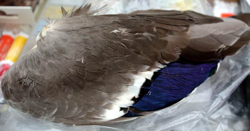 unten: Rebhuhnfedern. Weiter unten: Mallard-Federn, ein kompletter Stockentenflügel,