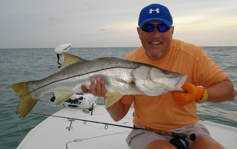 | Snook haben im August und September in Florida Hochsaison. Zwar findet man sie fast das ganze Jahr über an Docklampen in der Dunkelheit und in Mangrovenwäldern, aber im Sommer, wenn es generell weniger windig ist, kommen sie an die Strände (wegen besagter Köderfisch-Schwärme) und man kann sie früh morgens oder abends auf Sicht befischen. An der Westküste Floridas ist diese Art der Fischerei aufgrund der etwas ruhigeren See besonders spannend, an der Ostküste werden aber oft die grösseren Fische gefangen, oftmals unmittelbar in der ersten Welle am Strand. Mit dem Boot ist man sehr mobil und man bekommt wegen der höheren Position die Fische besonders gut zu Gesicht: vereinzelt stehen Fische in Tarpon-Grösse inmitten der Köderfisch-Schwärme und man muss zweimal hinsehen um sich zu vergewissern, dass es sich tatsächlich um Snook handelt. Snook dieser Grösse sind tolle Kämpfer an 8er bis 10er Gerät und der Drill verläuft etwas anders als an den Docks, die Fische machen bullige Fluchten und springen auch manchmal während des Drills aus dem Wasser. |