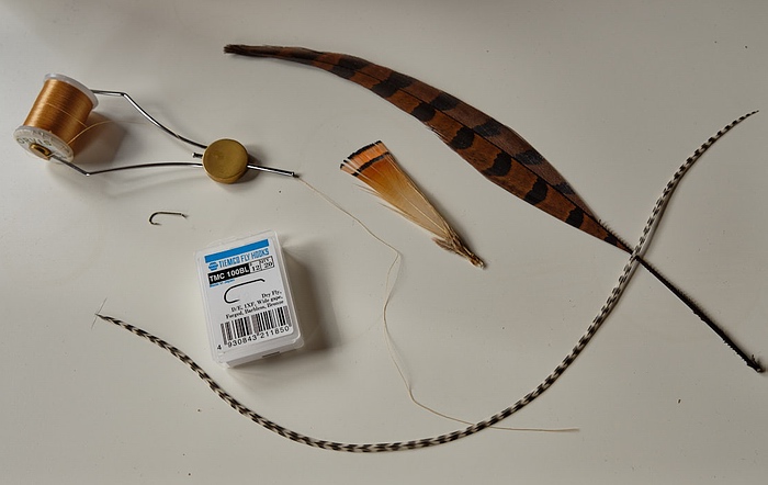 - Trockenfliegenhaken nach Wahl (hier Gr.12) - Bindefaden 6/0 in Gelb oder Beige - Fasanenschwanzfeder - Goldfasan Tippet Kopffeder - Hahnenhechel vom Sattel oder ähnlich Bindeanleitung: |