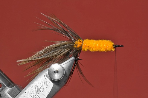 Haken: Kamasan B830 #10 Faden: UNI 8/0 W Schwarz Rippung: UTC Ultra Wire „Hot Yellow“ Beschwerung: Bleidraht flach Schwänzchen: kleine Flügelfedern (vom Bug) einer Fasan Henne Körper: einige Fibern von der Fasanstoßfeder (rot gefärbt) Thorax: Rabbit Dubbing rot Flügelscheide und Softhechel: Körperfeder Fasanhahn ( aus dem Schwanzbereich/ Chickabou) Lack für den Kopfknoten (Das Bild rechts ist das Orginal aus Sorsele, Schwedisch Lappland.) |