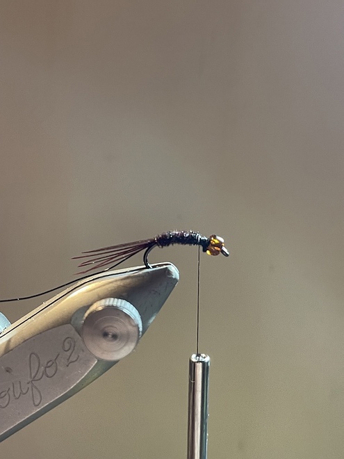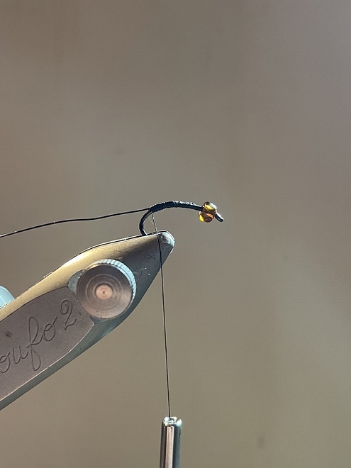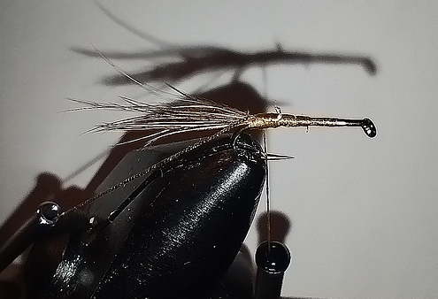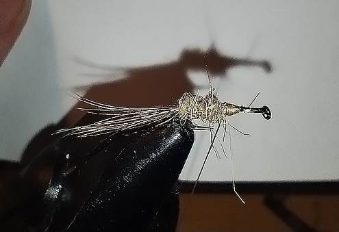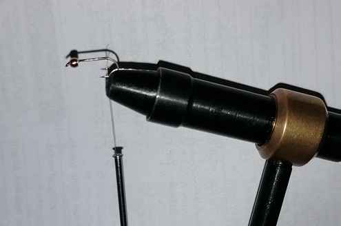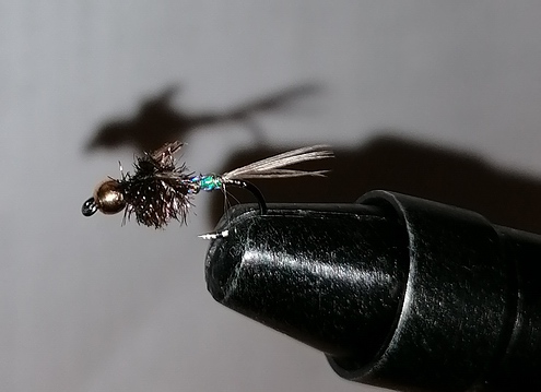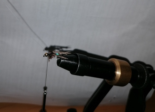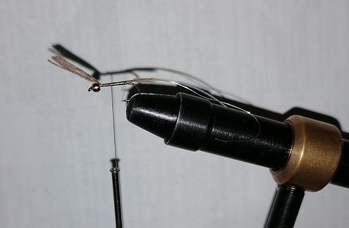 Messingperle 2,5 mm Schwanz: Fasan Abdomen:Pearl Tinsel Thorax: Pfauengras Rippung: 0.2 mm Silberdraht Flashback: Pearl Tinsel, UV Kleber Bindeanleitung: |