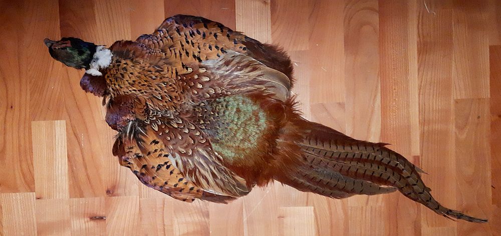 - zwei große Maribufedern, zu finden unter den Flügeldecken - je zwei große und kleine Kirchenfensterfedern, hier können die verschiedenen Farbtöne variiert werden - je eine größere und kleinere Körperfeder des Fasan, welche sich als Softhackle eignet |
