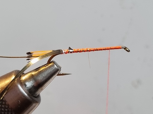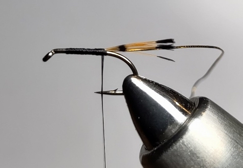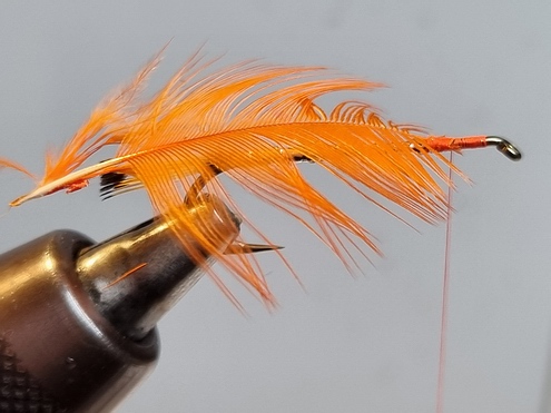 | (5) Eine Hennenhechel vorbereiten und mit der Spitze vorn einbinden. Darauf achten, dass genügend Platz nach vorn eingeplant wird. |