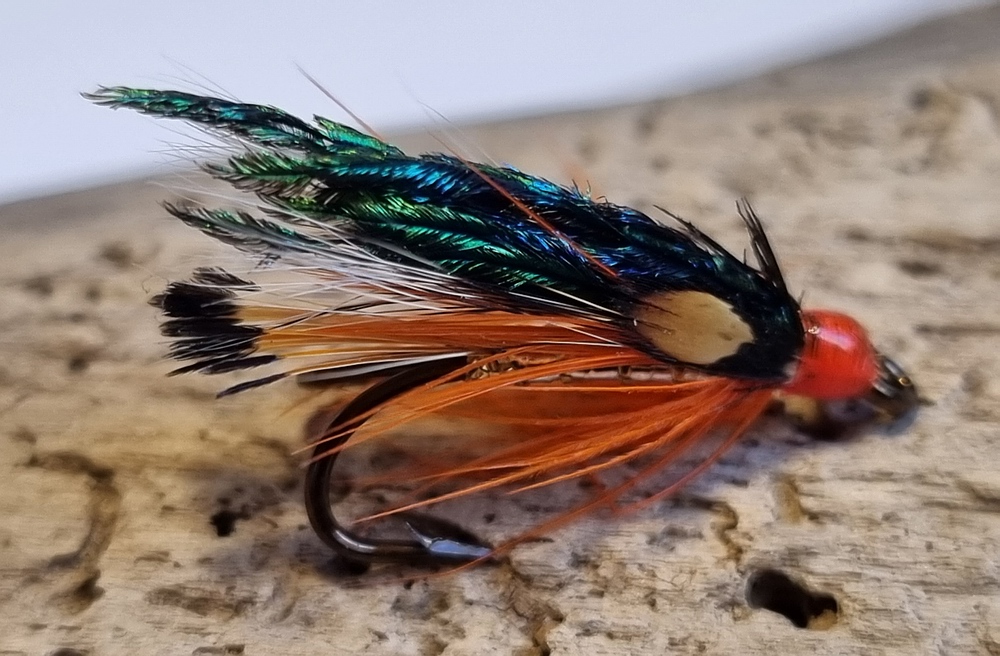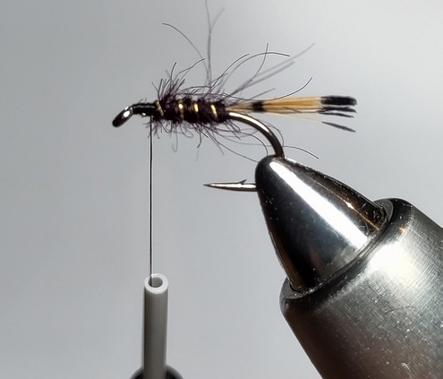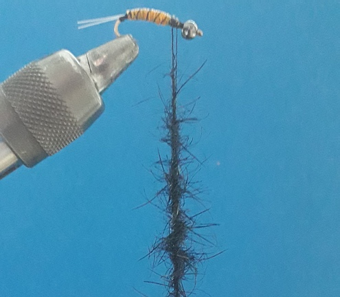 Die meisten unserer im Frühjahr gefangenen Rotgetupften fallen je nach Wasserstand auf die gelblich schillernden Nymphen, Hechelfliegen, No hackle Trockenfliegen oder Streamer herein. Meine erste Wahl im Frühjahr, insbesondere bei Saisonbeginn, ist die von mir gebundene Nymphe mit schwarzem Tungstenkopf. Wie gebunden imitiert die Nymphe meiner Meinung nach eine Larve der Eintagsfliege und im späten Frühjahr ggf. sogar eine Steinfliegenlarve. Kürzt man am Wasser die Schwanzspitzen ein und trimmt den Brustkranz wesentlich, fische ich die Nymphe als Köcherfliegenlarve. Material: