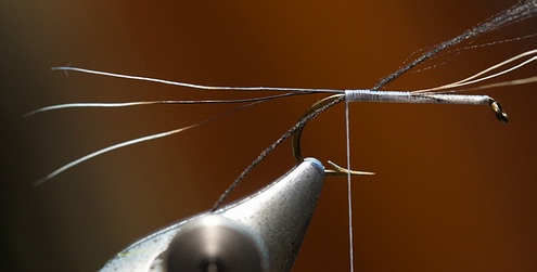 (8) Das Büschel entnehmen und auf den Haken oben auflegen, dabei festhalten und fest einbinden. Die Spitzen sollten etwa bis zu dem Schwanzende reichen. |