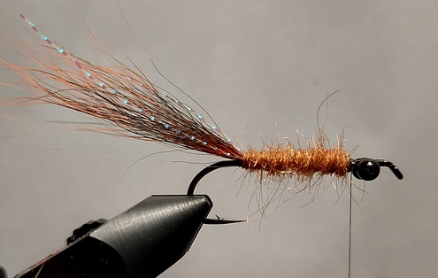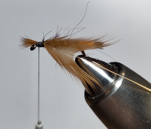 | (8) Überstehende CDC Federn abschneiden. | (9) Nochmals Dubbing vom argentinischen Hasen anbringen und die Fliege mit einem Köpfchen abschließen. |