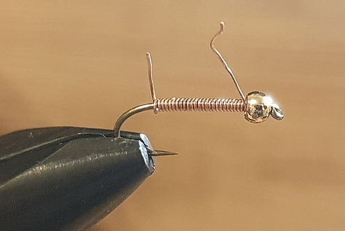 hinter der Kopfperle machen. Die Fibern nach hinten streifen und mit Bindegarn