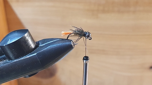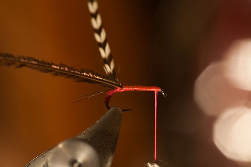 8. Den Bindefaden das letzte Drittel nach vorne winden und die Fliege mit einem Kopfknoten abschließen und mit Bindelack sichern. |