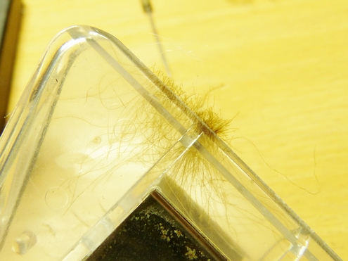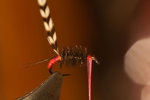 | (3) Die vom Flaum befreite, einseitig etwas „gerupfte“ Softhacklefeder unmittelbar hinter dem Öhr einbinden. | (4 ) Den hängenden Faden im oberen Bereich mit Wachs oder Kleber bestreichen und etwas feines Dubbing leicht „struppig“ als Thorax einbinden. |
