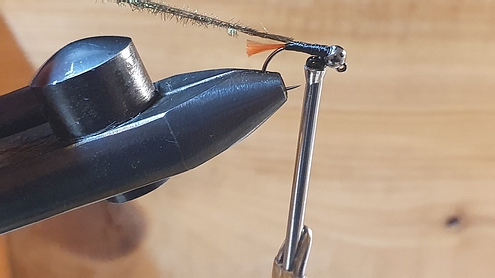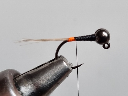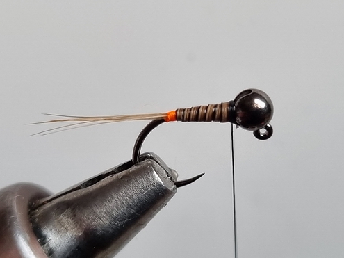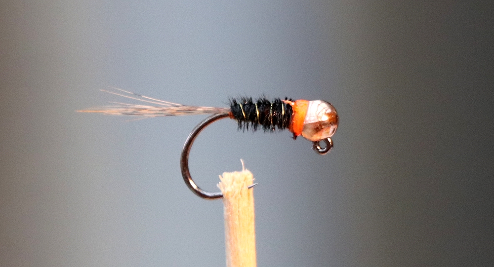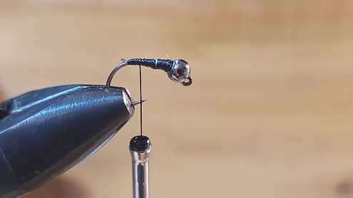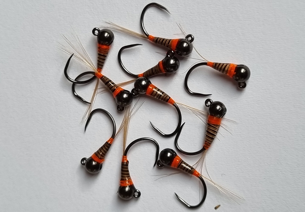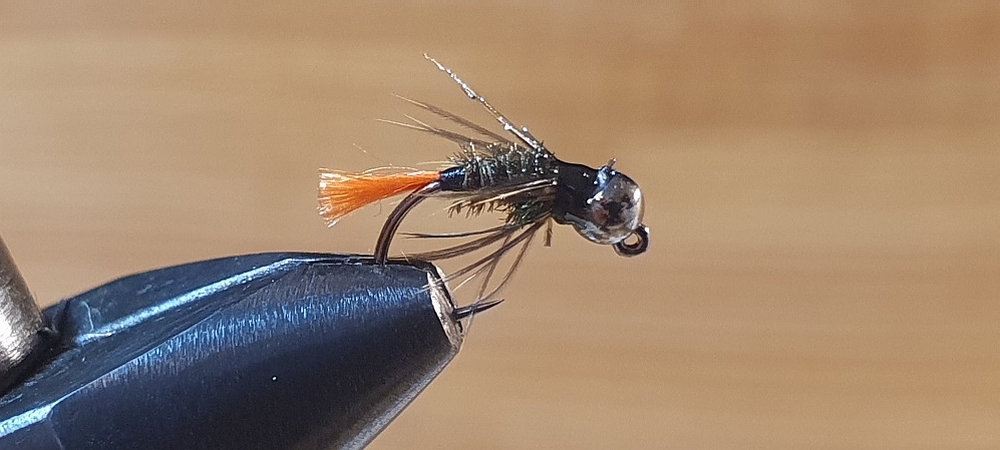 Ich habe zwar keinen direkten Vergleich zu andersfarbigen Kopfperlen, bin aber dennoch von der Ausführung mit schwarzem Kopf überzeugt. An Gewässern mit hohem Befischungsdruck sicherlich nicht die schlechteste Wahl. Ich habe die Fliegen mit folgenden Materialien gebunden: - Haken: Jig-Haken Gr.14