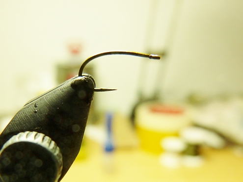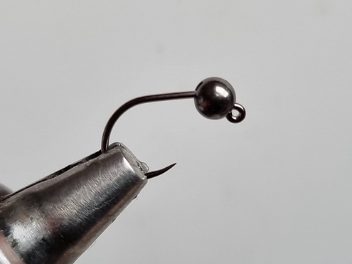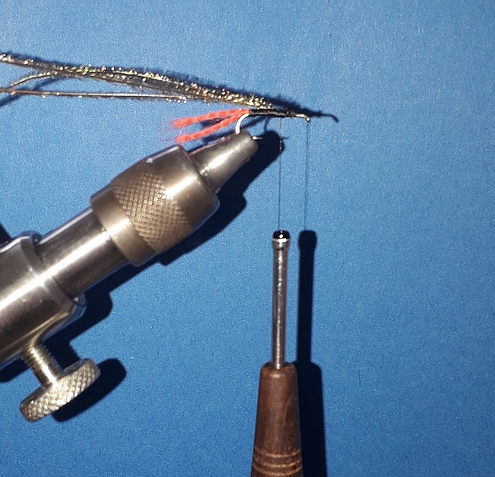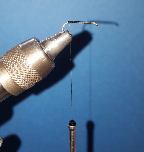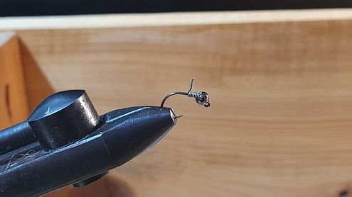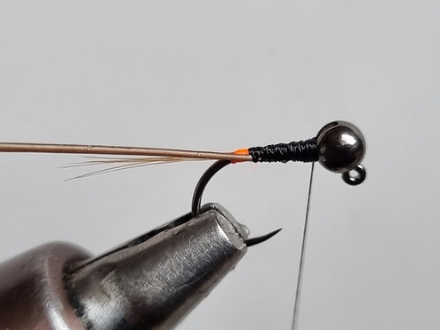 | Verwendete Bindematerialien | (1) Kopfperle auf den Haken schieben und Haken in Bindestock einspannen, ca. 2-3mm feinen Bleidraht hinter der Perle wickeln und in den Hohlraum der Kopfperle pressen |