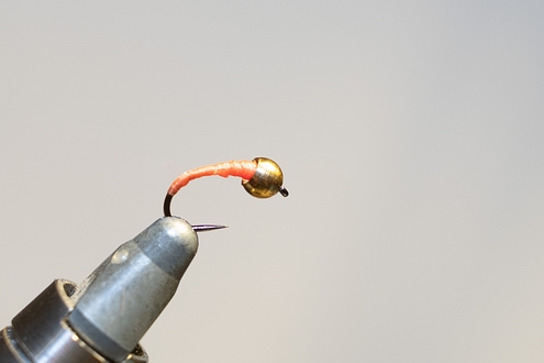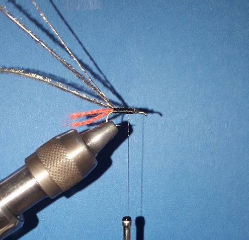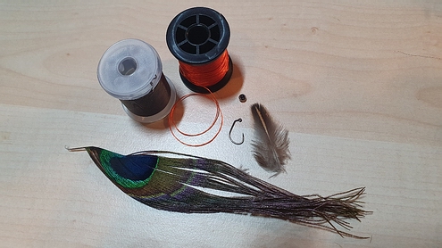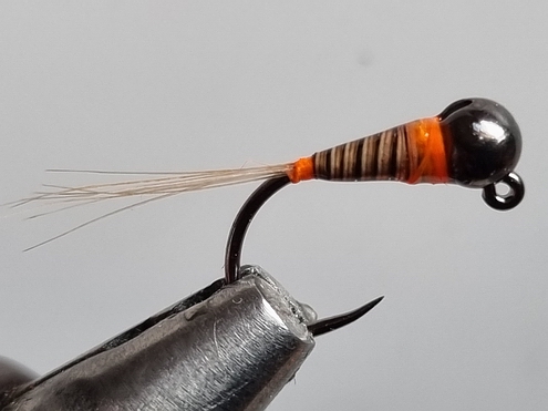 1. Haken Gr. 16 mit einer 3 mm Perle versehen und einspannen 2. Schwänzchen hinten einbinden sowie einen dünnen Draht zum Rippen 3. Mit dem Bindefadeneinen konischen Körper vorformen und anschließend hinten 2 Fibern von Fasanenschwanz einbinden. 4. Die Fansanenfibern nach vorne winden, abbinden und anschließend mit dem Draht gegenläufig nach vorne rippen 5. Zum Schluß einen roten oder orangen Kragen wickeln. |